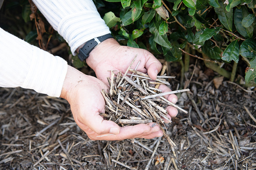 茶草場農法とは、茶園の畝間にススキやササを主とする刈敷きを行う伝統的農法のことです。静岡県で特徴的に見られる農法であり、2013年には世界重要農業遺産(Globally Important Agricultural Heritage System)として認定されました。この茶草場農法を行うことによって、自然の有機質が肥料となり、お茶の味や香りが良くなると言われています。